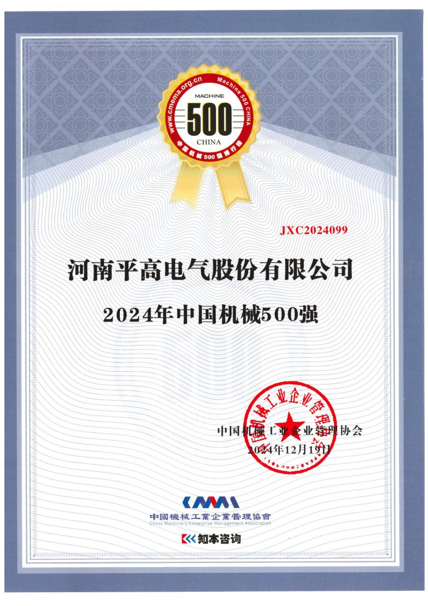 12月25日,从河南平高电气股份有限公司(以下简称“平高电气”)获悉,在近日中国机械工业企业管理协会召开的2024年世界一流暨中国机械500强研究报告发布、示范工程表彰大会上,平高电气凭借卓越的综合实力成功斩获“2024年中国机械500强”荣誉称号,这一佳绩是其多年来稳健发展的有力见证,也彰显了其在行业内不断攀升的影响力。